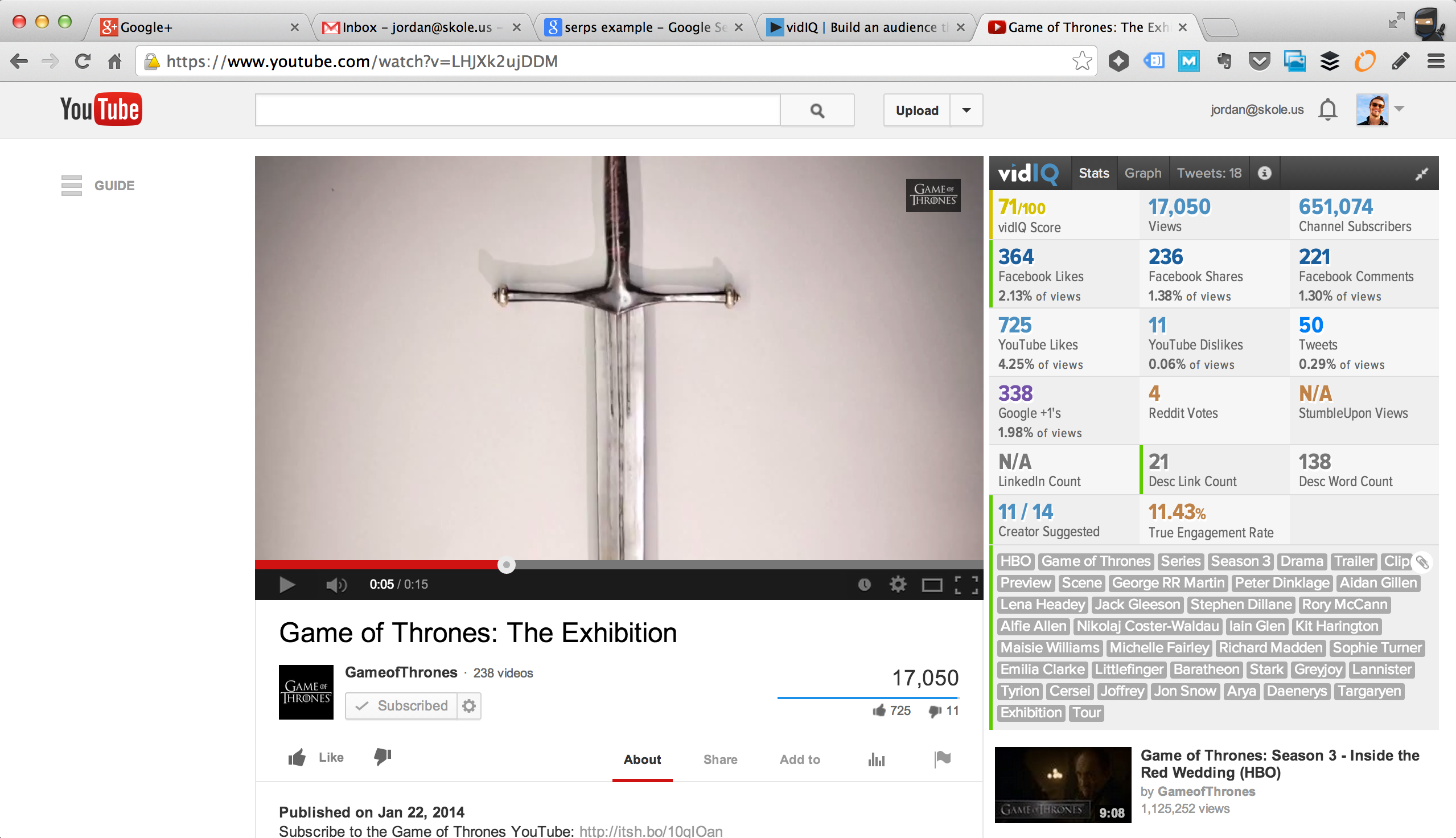 Ever wonder what YouTube video is going to go viral? With vidIQ you can stop wondering. The VidIQ chrome extension layers gobs of additional meta data into your YouTube browsing experience. Discover deep video insights such as Facebook likes, Facebook Shares, Tweets, Google Plusses, and much more. All of this data is calculated to create a vidIQ score.