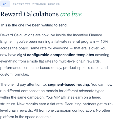 No other referral or affiliate platform in the market supports segment-aware compensation routing at the campaign level. Operators managing programs with multiple advocate types — consumers, affiliates, resellers, franchise partners — can now run the right compensation model for each group from a single campaign configuration, without building separate programs.